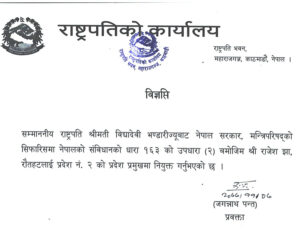 मन्त्रिपरिषद्को सिफारिसमा राष्ट्रपति विद्यादेवी भण्डारीले रौतहटका झालाई प्रदेश प्रमुख नियुक्त गनुृभएको हो ।