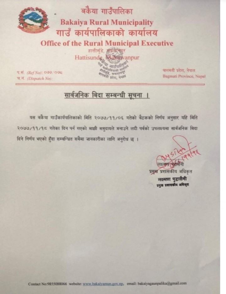 मकवानपुरको बकैया गाउँपालिकामा भोली मंगलबार सार्वजनिक विदा हुने भएको छ ।