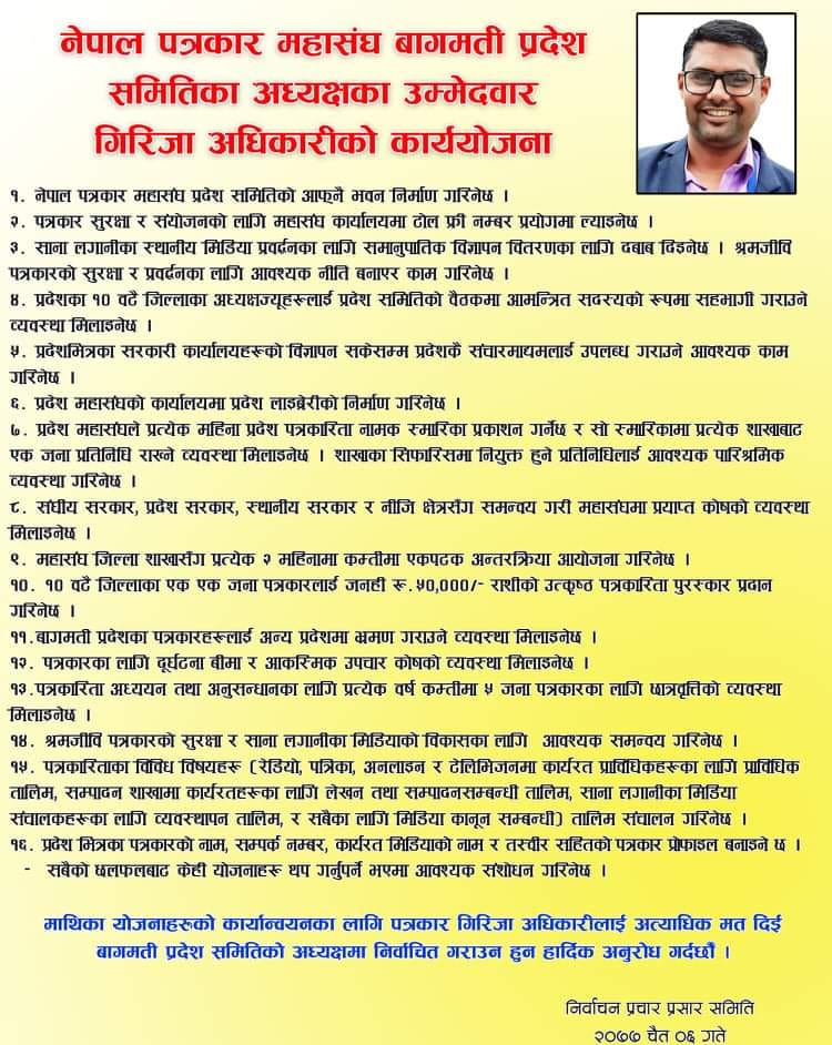 नेपाल पत्रकार महासंघको चैत २५ गते हुने निर्वाचनका लागि मकवानपुरका पत्रकार गिरिजा अधिकारीले बागमती प्रदेश अध्यक्षमा उम्मेदवारी घोषणा गर्दै प्रतिवद्धता सार्वजनिक गर्नु भएको छ।