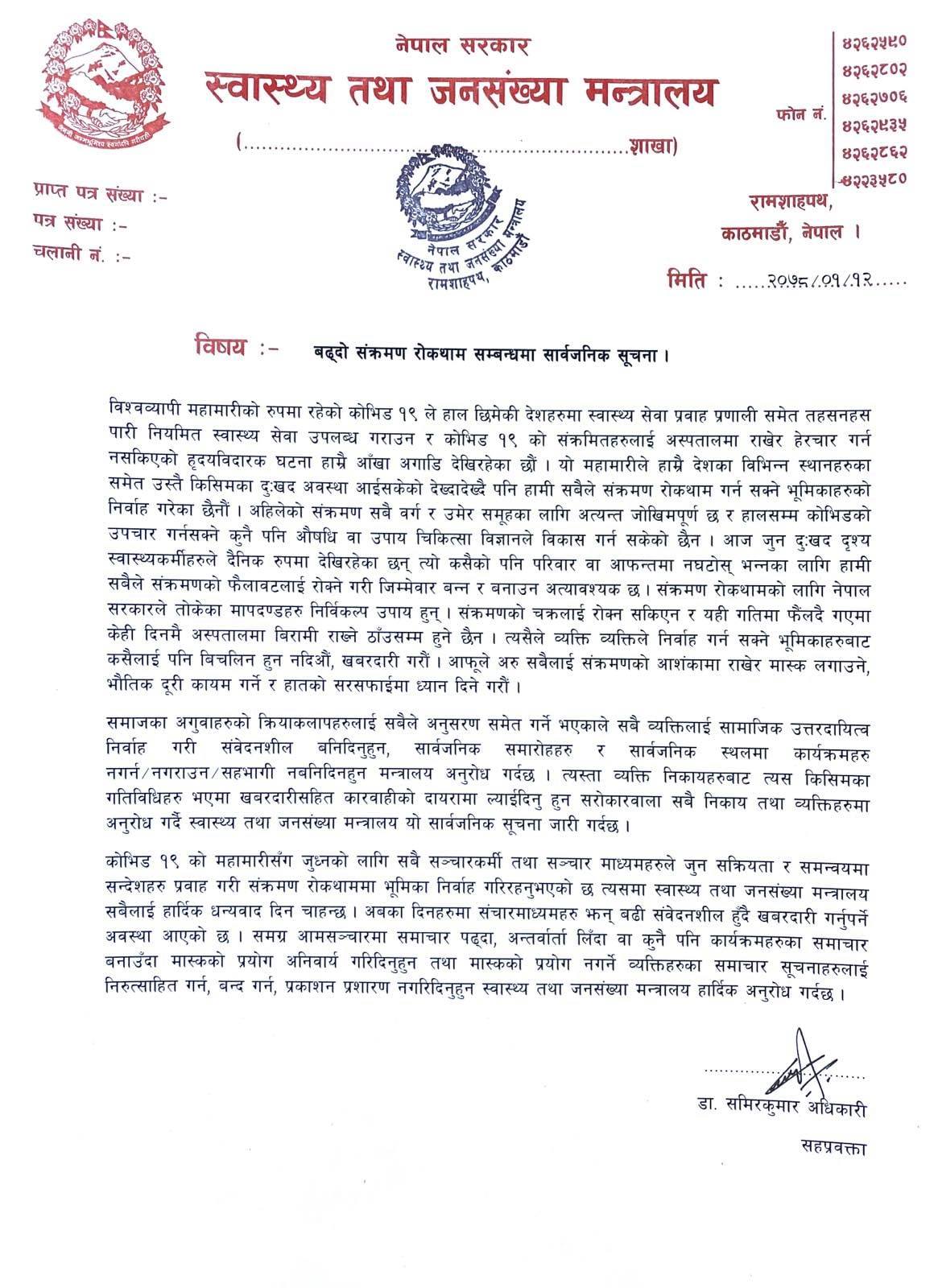 मन्त्रालयले सार्वजनिक सूचना प्रकाशित गर्दै सङ्क्रमणको चक्र रोक्न नसकिएमा केही दिनभित्रै अस्पतालमा बिरामी राख्ने ठाउँ नहुने चेतावनी दिएको हो, उज्यालो अनलाइनले लेखेको छ । कोरोना सङ्क्रमितको उपचारका लागि कुनै पनि औषधि उपाय विकास नभइसकेकाले अहिलेका लागि रोकथाम गर्न सरकारले तोकेका मापदण्डहरू नै निर्विकल्प रहेको मन्त्रालयले जनाएको छ ।