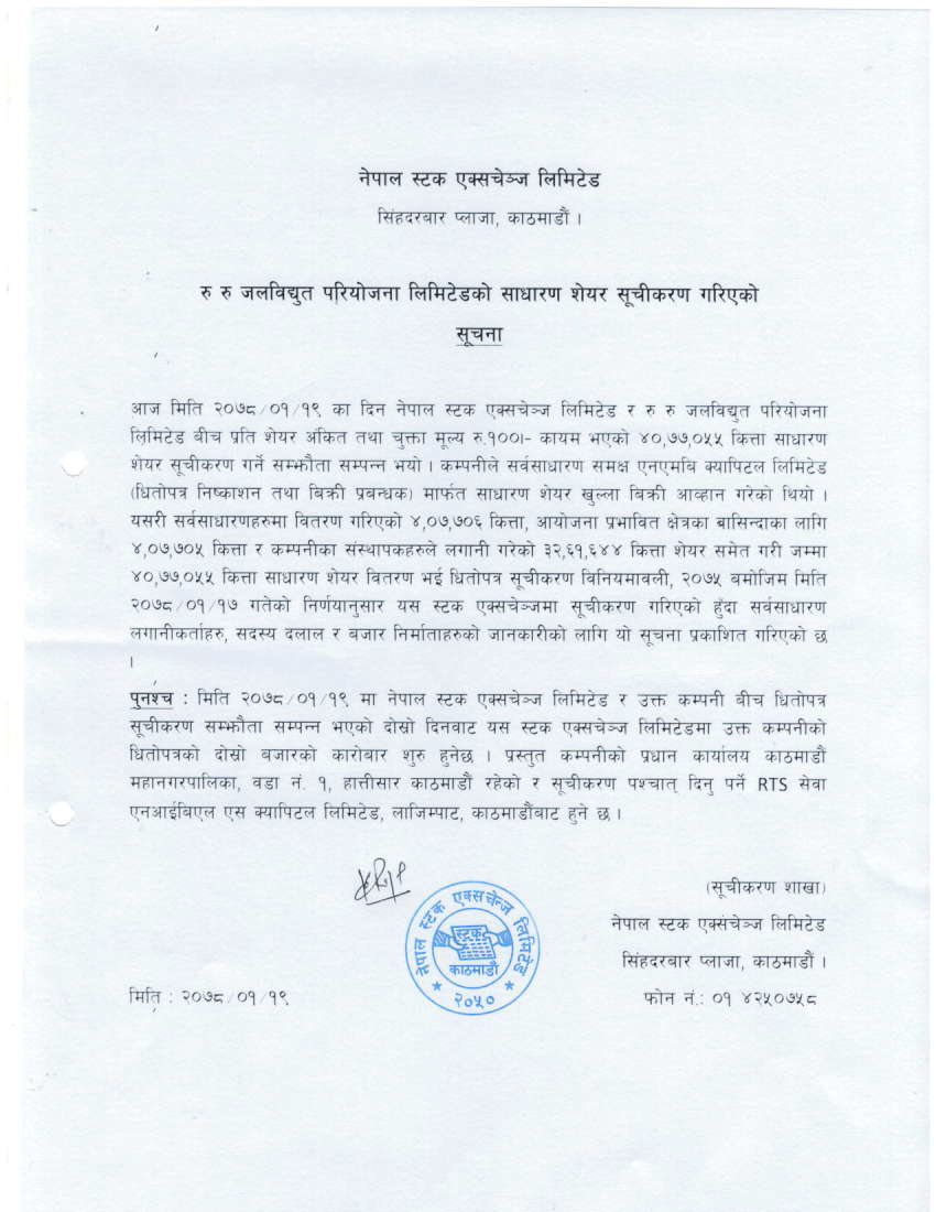 रु रु जलविद्युत परियोजना लिमिटेड (RuRu) को साधारण शेयर नेप्सेमा सूचीकृत भएको छ ।