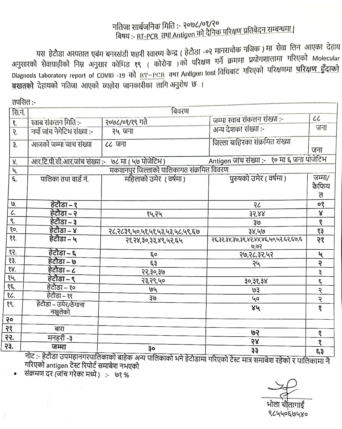 संक्रमित मध्ये ३० जना महिला र ३३ जना पुरुष रहेको हेटौंडा उपमहानगरपालिकाका जनस्वास्थय निरिक्षक भोला चौलागाईले जानकारी दिनुभयो ।