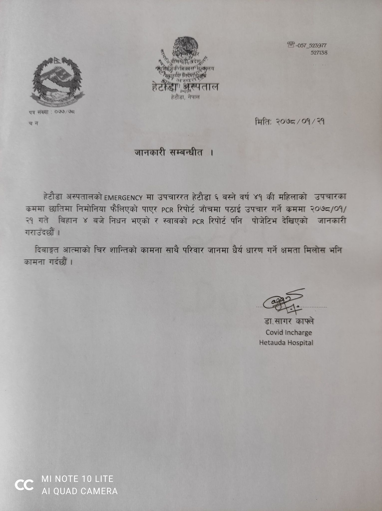 मदन भण्डारी स्वास्थ्य विज्ञान प्रतिष्ठान हेटौडा अस्पतालमा उपचारको क्रममा ती महिलाको मृत्यु भएको अस्पतालका कोभिड ईन्चार्ज डाक्टर सागर काफ्लेले जानकारी दिनुभयो ।