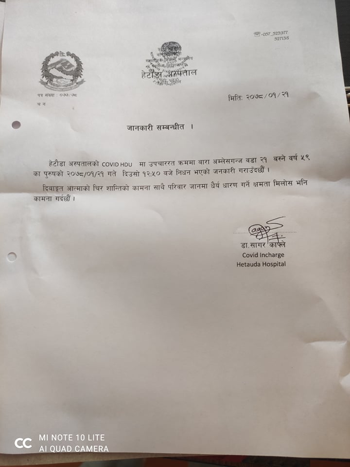 हेटौंडा अस्पतालको कोभिड एच डि यु (High Dependency Unit) मा उपचाररत बाराको अमलेखगंज २१ का ४९ बर्षका पुरुषको मृत्यु भएको अस्पतालका कोभिड ईन्चार्ज डाक्टर सागर काफ्लेले जानकारी दिनुभयो । ती पुरुषको दिउँसो १२ बजेर ५० मिनेटमा ज्यान गएको डाक्टर काफ्लेले बताउनु भएको छ ।