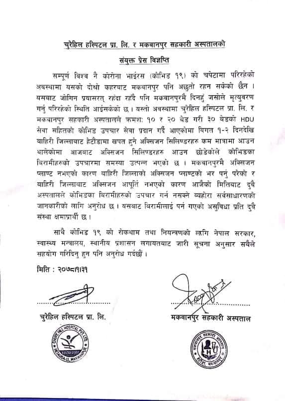 कोरोना संक्रमितको उपचार गरिरहेका मकवानपुरका दुई निजी अस्पतालले पनि थप संक्रमितको उपचार गर्न नसक्ने बताएका छन् । हेटौंडामा रहेको चुरे हिल अस्पताल र मकवानपुर सहकारी अस्पतालले कोरोना संक्रमितको उपचार गर्न नसक्ने बताएका हुन्् । चुरेहिल अस्पताल प्रा.लि र मकवानपुर सहकारी अस्पतालले आज संयुक्त प्रेस विज्ञप्ति जारी गर्दै बाहिरी जिल्लाबाट अक्सिजनको सिलिन्डर आउन छोडेपछि उपचारमा समस्या भएको बताएका छन् ।