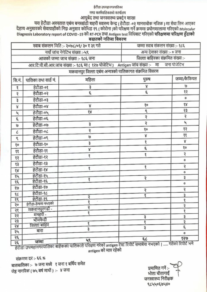 यस्तै मकवानपुरमा आइतबार थप १२७ जनामा संक्रमण पुष्टि भएको छ । बैशाख ३० र ३१ गते संकलित नमुना मध्ये १८६ को पीसीआर परिक्षण गर्दा १२७ जनामा संक्रमण पुष्टि भएको हेटौंडा उपमहानगरपालिकाकाजनस्वास्थय निरीक्षक भोला चौलागाईले जानकारी दिनुभयो ।