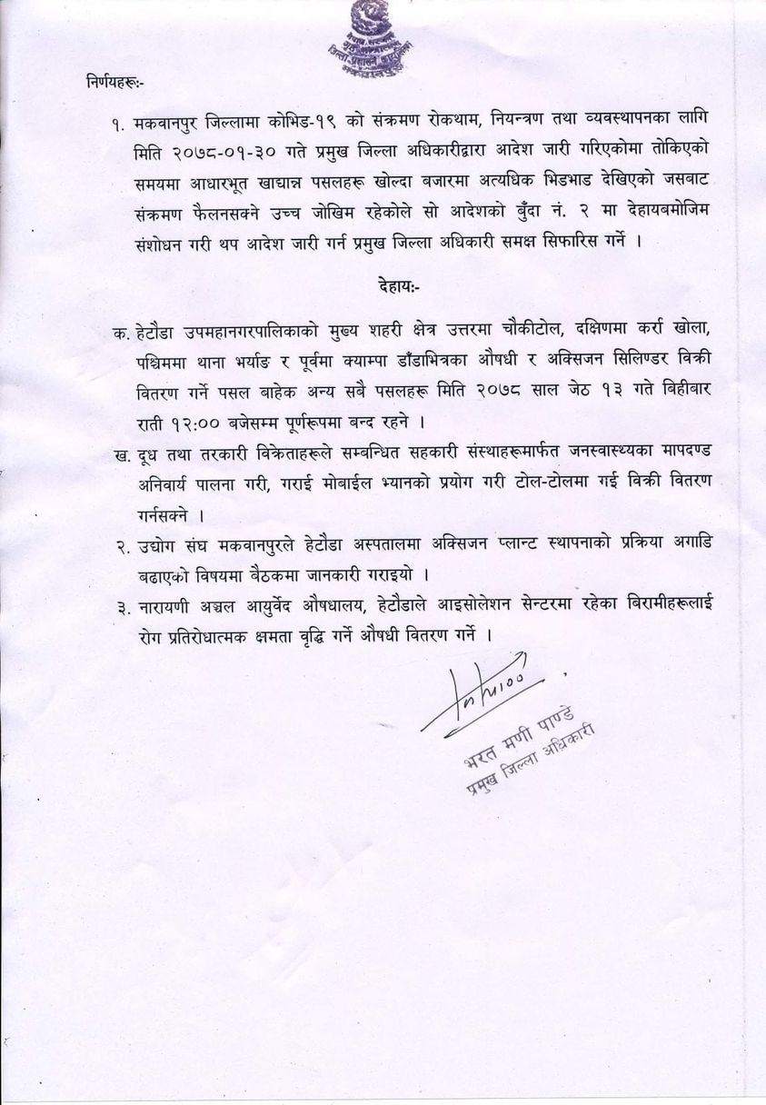 निषेधाज्ञा भर खाद्यान्न तथा तरकारी पसल पूर्ण रुपमा बन्द भएपनि सम्पूर्ण स्वास्थ्य सुरक्षा अपनाएर टोल टोलमा पुर्याउने व्यवस्था मिलाउने निर्णय गरिएको जिल्ला प्रशासन कार्यालय मकवानपुरले जनाएको छ ।