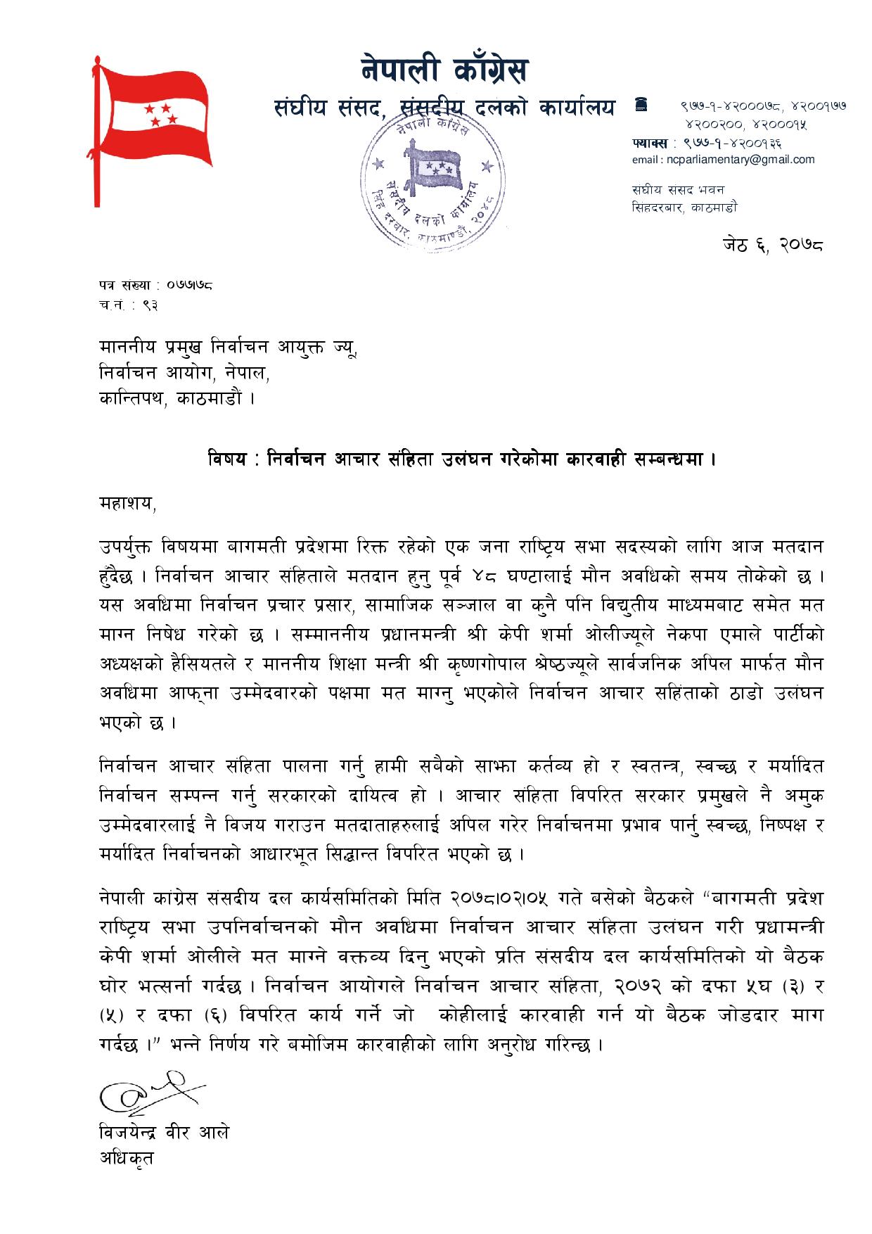 कांग्रेस संसदीय दलले निर्वाचन आयोगमा आज उजुरी दर्ता गराएको हो । आचारसंहिता विपरीत सरकार प्रमुखले नै उम्मेदवारलाई नै विजय गराउन मतदातालाई अपिल गरेर चुनावमा प्रभाव पार्नु स्वच्छ, निष्पक्ष र मर्यादित चुनावको आधारभूत सिद्धान्त विपरीत भएको उजुरीमा भनिएको छ ।