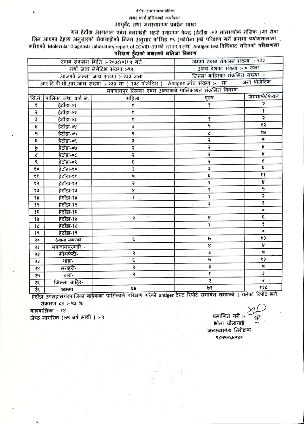 २३३ जनाको स्वाव परिक्षण गर्दा १३८ जनामा संक्रमण पुष्टि भएको चौंैलागाईले बताउनुभयो । आज थपिएका संक्रमितमा सबैभन्दा बढी हेटौंडा उपमहानगरपालिकाका ९३ जना रहेको चौंलागाईले बताउनुभयो । ती मध्ये हेटौडा ५ का मात्रै १७ जना छन् ।