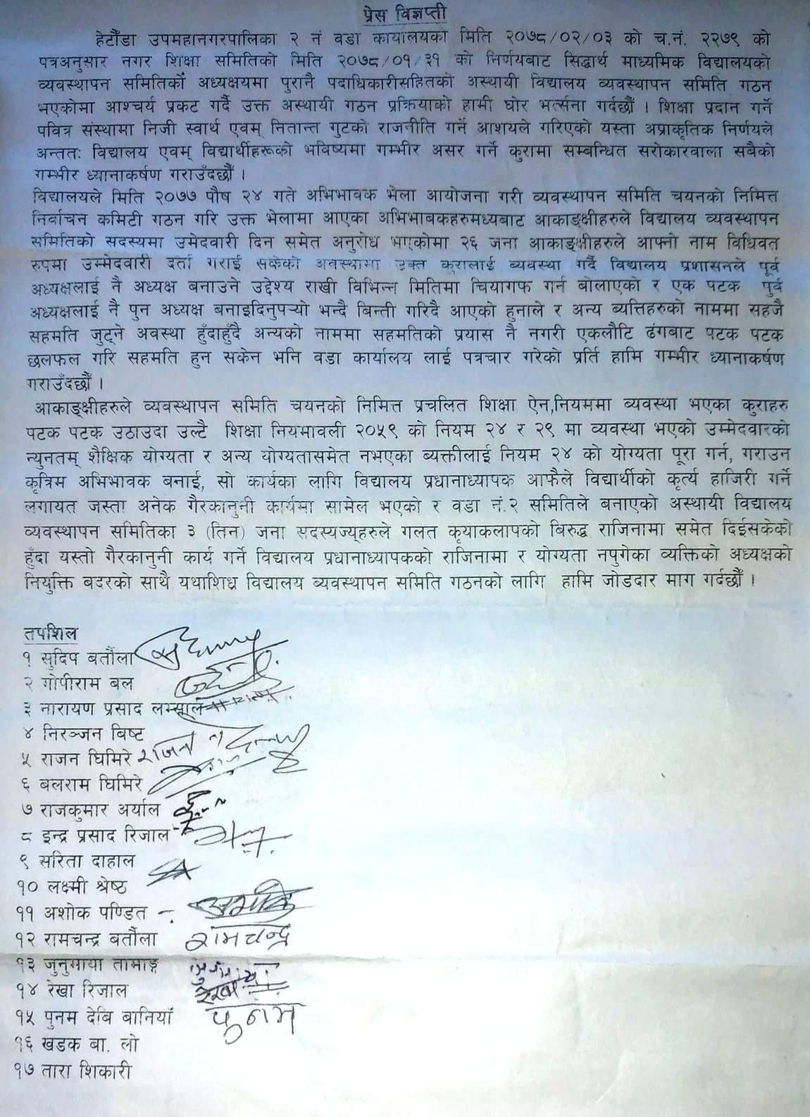 समितिको अध्यक्षयमा गैर कानुनी ढंगले पुरानै विद्यालय व्यवस्थापन समितिलाई निरन्तरता दिनेगरी निर्णय भएको भन्दै उनीहरुले प्रधानाध्यापकको राजिनामा माग गरेका हुन् । नयाँ समितिका लागि उम्मेद्वारी दिएका मध्ये १७ जनाले संयुक्तरुपमा आइतबार एक विज्ञप्ति जारी गरी योग्यता नपुगेका व्यक्तिको अध्यक्षको नियुक्ति बदर गर्दै यथाशिध्र विद्यालय व्यवस्थापन समिति गठन गर्न माग गरेका छन् ।