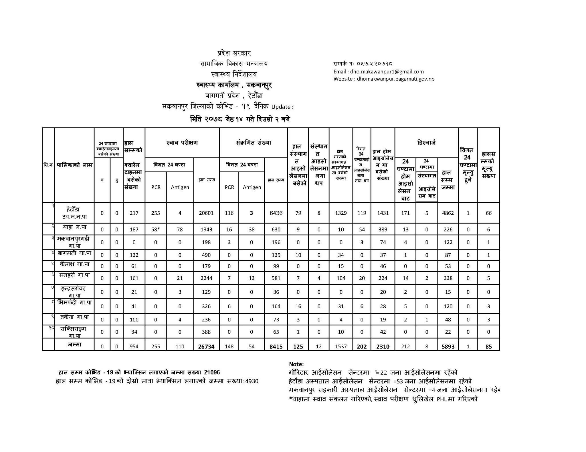 पछिल्लो २४ घण्टामा पीसीआर परिक्षणबाट १४८ जना र एन्टीजेन परिक्षणबाट ५४ जना गरी २०२ जनामा संक्रमण पुष्टि भएको स्वास्थ्य कार्यालय मकवानपुरले जानकारी दिएको छ । परिक्षण गरिएका मध्ये सबै भन्दा धेरै ११९ जना हेटौंडा उपमहानगरपालिका क्षेत्रका छन् ।