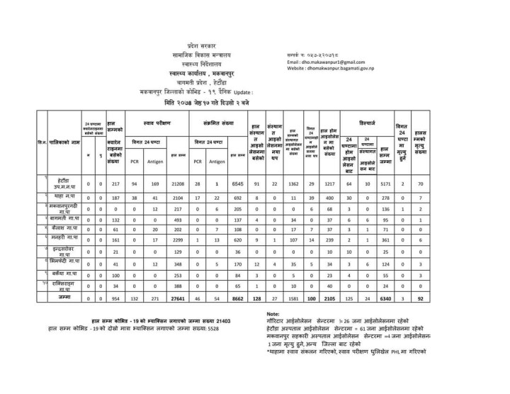 यस्तै हेटौंडा उपमहानगरपालिककाका २९ जना, मनहरी गाउँपालिकाका १४ जना, कैलाशका ७ जना, मकवानपुरगढीका ६ जना र भीमफेदीका गाउँपालिकाका ५ जनामा कोरोना संक्रमण पुष्टि भएको छ । योसंगै मकवानपुरमा कोरोना पुष्टि हुनेको संख्या ८ हजार ६ सय ६२ पुगेको कार्यलयले जनाएको छ ।