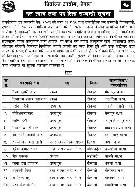 २०७४ सालको पालिकाको चुनावमा माओवादी केन्द्रको तर्फबाट उमेद्वार भएर विजयी भएका तर दल त्याग गरेका उनीहरुलाई माओवादी केन्द्रले पदमुक्त गर्न माग गर्दै निर्वाचन आयोगलाई जानकारी गराएको थियो । आयोगले विज्ञप्ति निकालेर माओवादी केन्द्र छाडेर एमालेमा गएका दुई मेयर र पाँच उपमेयरसहित १४ जनप्रतिनिधिको पद रिक्त भएको जानकारी गराएको हो ।