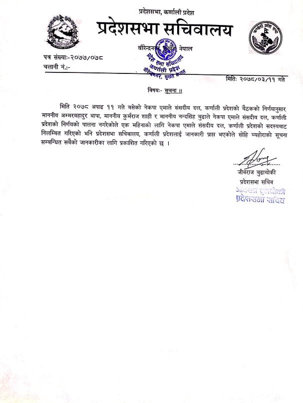 ‘एमाले संसदीय दलको निर्णयको पालना नगरेकोले एक महीनाका लागि नेकपा एमाले संसदीय दल कर्णाली प्रदेशको संसदबाट निलम्बित गरिएको भनी प्रदेशसभा सचिवालय कर्णाली प्रदेशलाई जानकारी प्राप्त भएकोले सोही व्यहोराको सूचना सम्बन्धित सबैको जानकारीका लागि प्रकाशित गरिएको छ’ सचिवालयद्वारा जारी सूचनामा भनिएको छ ।