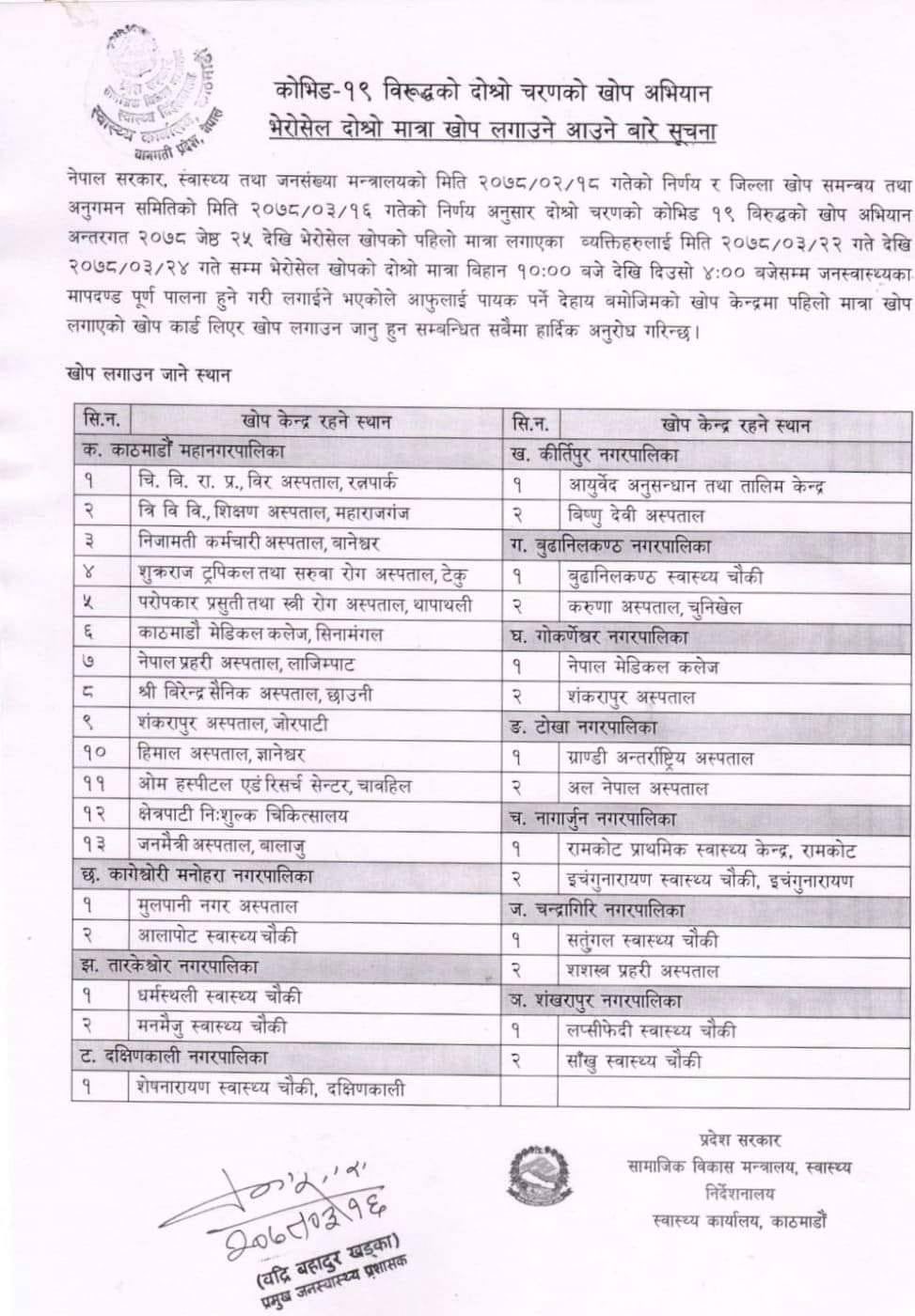 वागमती प्रदेशको सामाजिक विकास मन्त्रालय अन्तर्गत स्वास्थ्य निर्देशनालयले सूचना निकालेर काठमाण्डाै महानगर, कागेश्वरी मनोहरा नगरपालिका, तारकेश्वर नगरपालिका, दक्षिणकाली नगरपालिका, कीर्तिपुर नगरपालिका, बूढानीलकण्ठ नगरपालिका, गोकर्णेश्वर नगरपालिका, टोखा नगरपालिका, नागार्जुन नगरपालिका, चन्द्रागिरी नगरपालिका र शङ्खरापुर नगरपालिकाका विभिन्न ठाउँका खोप केन्द्रबाट खोप दिइने जनाएको छ।