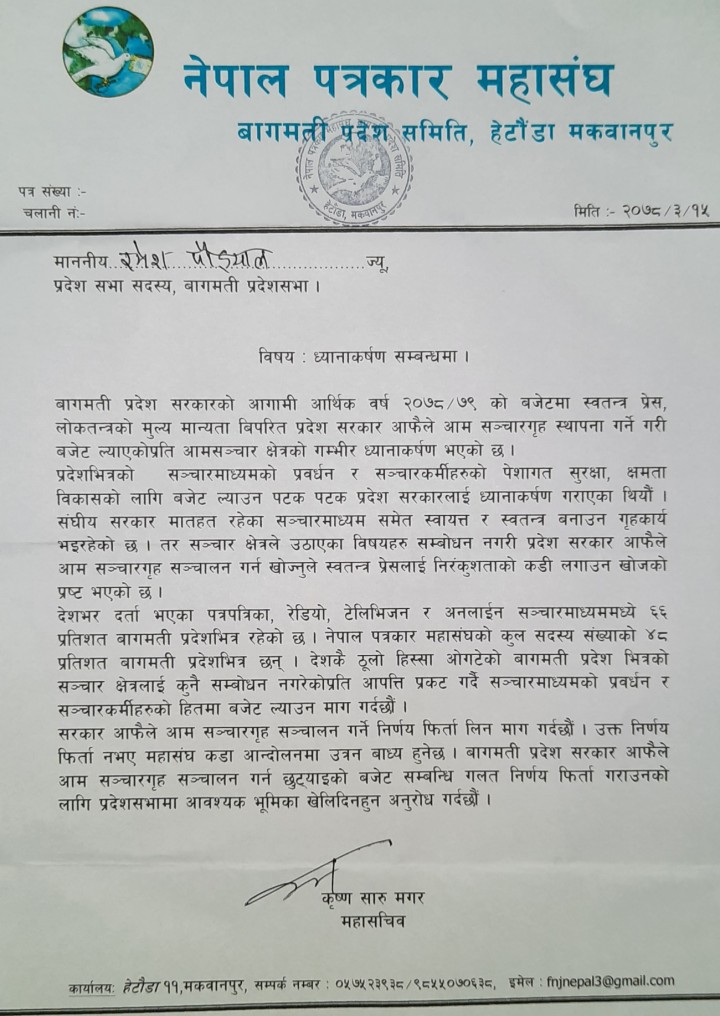 ‘बागमती प्रदेश सरकारको आगामी आर्थिक वर्ष २०७८/७९ को बजेटमा स्वतन्त्र प्रेस, लोकतन्त्रको मुल्य मान्यता बिपरित प्रदेश सरकार आफैले आम सञ्चारगृह स्थापना गर्ने गरी बजेट ल्याएकोप्रति आमसञ्चार क्षेत्रको गम्भीर ध्यानाकर्षण भएको छ’, ज्ञापन पत्रमा भनिएको छ, ‘देशकै ठूलो हिस्सा ओगटेको बागमती प्रदेश भित्रको सञ्चार क्षेत्रलाई कुनै सम्बोधन नगरेकोप्रति आपत्ति प्रकट गर्दै सञ्चारमाध्यमको प्रवर्धन र सञ्चारकर्मीहरुको हितमा बजेट ल्याउन माग गर्दछौं ।’