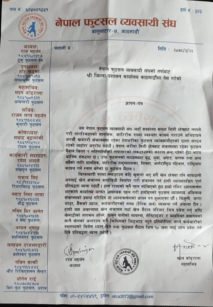 फुटसल व्यवसायीहरुको छाता संगठन नेपाल फुटसल व्यवसायी संघले कोभिड १९ को कारण फुटसल व्यवसायीमा परेको असरलाई मध्यनजर राख्दै जिल्ला प्रशासन कार्यालय काठमाण्डौलाई एक ज्ञापन पत्र बुझाएका छ ।