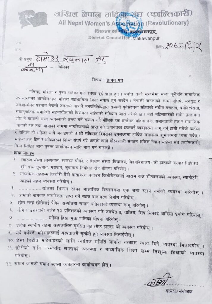 अखिल नेपाल महिला संघ क्रान्तिकारी बकैया गाउँ कमिटीले मंगलबार पालिका अध्यक्ष दामोदर खनाल, उपाध्यक्ष सरला बोलखे र प्रमुख प्रशासकीय अधिकृत लक्ष्मण पुडासैनीलाई संयुक्त रुपमा ज्ञापन पत्र बुझाएका हुन् । शिक्षण संस्था, स्वास्थ्य संस्था वरपर धुम्रपान, मद्यपान र जुवातास निषेध क्षेत्र घोषणा गरिनुपर्ने, माध्यमिक तहसम्म विद्यालयलाई किशोरी मैत्री बनाउनु पर्ने, सेफ हाउस व्यवस्था हुनुपर्ने लगायतका माग ज्ञापन पत्रमा समेटिएको छ ।