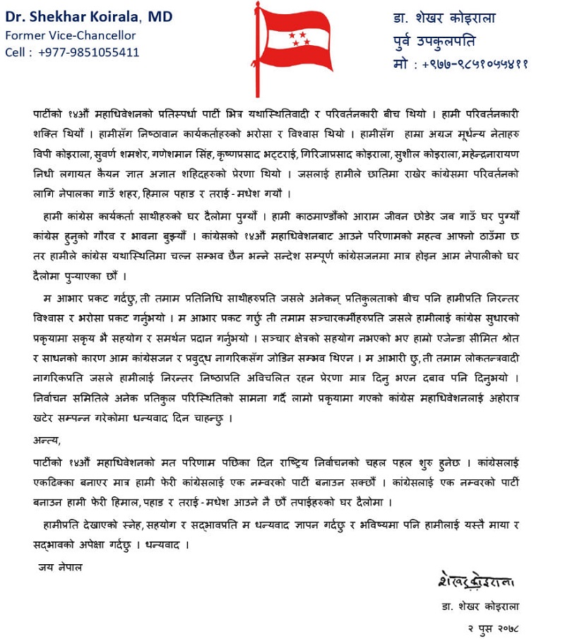 नेपाली कांग्रेसको सभापतिमा पराजित नेता डा. शेखर कोइरालाले चुनाव हारे पनि प्रतिनिधि र लोकतन्त्रवादीहरुको मन जित्न सफल भएको बताउनुभएको छ ।