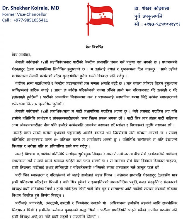 विज्ञप्तिमा पार्टीको आन्तरिक निर्वाचनमा जय र पराजयलाई स्वाभाविक रुपमा लिएको तथा परिवर्तनको पक्षमा उभिएकाले मत परिणामबाट धेरै उत्साही र धेरै हतोत्साही नहुने उल्लेख छ ।साथै उहाँले सभापति शेरबहादुर देउवाको कार्यकालमा पार्टी पुनर्स्थापित हुने विश्वास पनि व्यक्त गर्नुभएको छ । साभारः उज्यालो अनलाइन ।