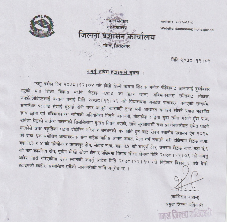 जिल्ला सुरक्षा समितिको बुधबार बसेको बैठकले आज बिहान ६ बजेदेखि कर्फ्यु हटाउने निर्णय गरेको हो । लेटाङ–५ मा स्थानीय एक शिक्षकले आफ्नै विद्यालयका छात्रालाई होलीको दिन यौन दुर्व्यवहार गरेको विषयलाई लिएर गएको आइतवार तनाव भएको थियो ।