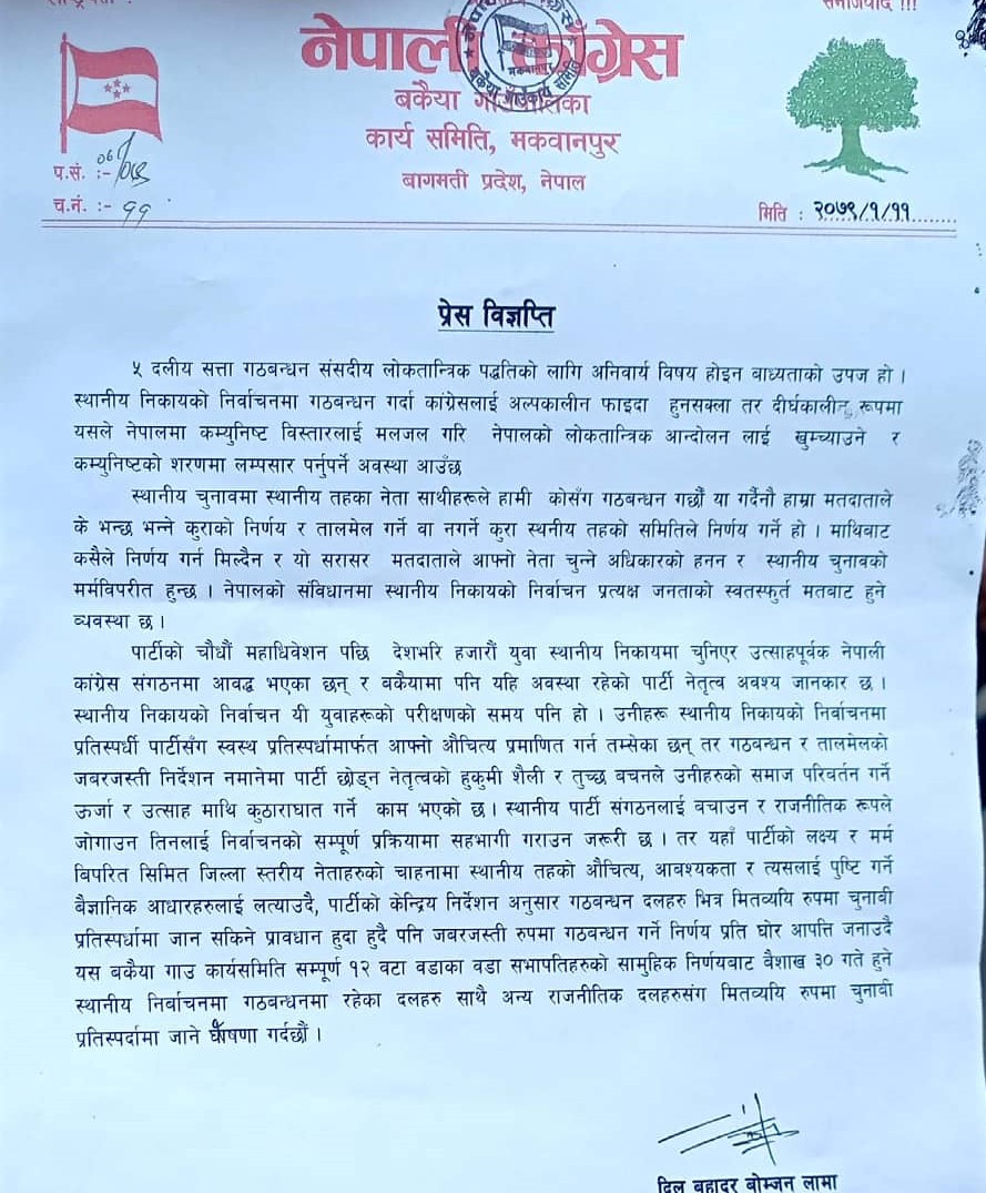 नेपाली कांग्रेस बकैया कार्यसमितिले जारी गरेको प्रेस विज्ञप्ती