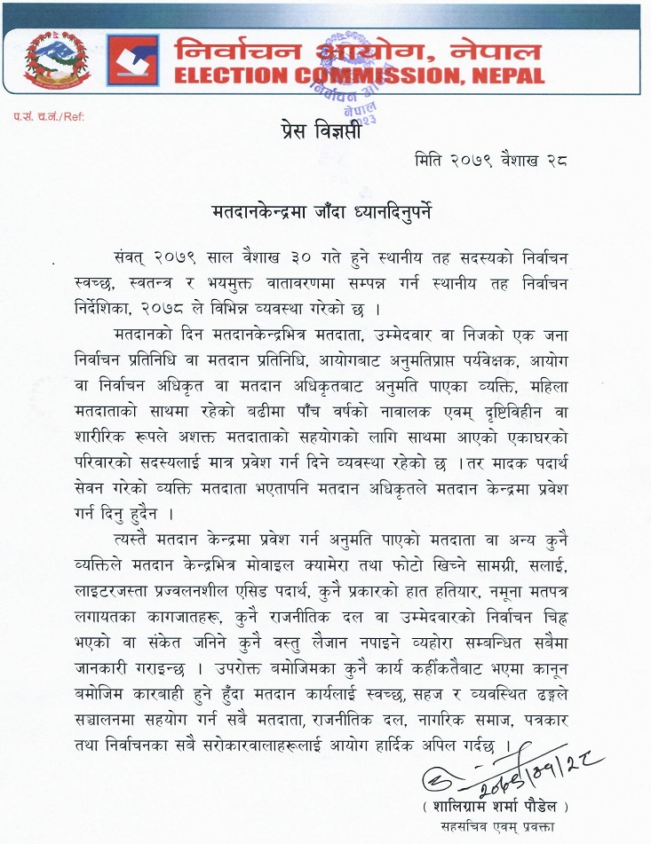 यस्तै मतदान केन्द्रभित्र मोबाइल, क्यामेरा तथा फोटो खिच्ने सामग्री, सलाइ, लाइटर, कुनै प्रकारको हातहतियार लगायतका वस्तु लैजान नपाइने उल्लेख छ। आयोगले यस्ता कार्य गरेको भेटिएमा कानुन बमोजिम कारबाही हुने जनाएको छ।