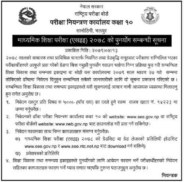 बोर्डले बुधवार २०७८ सालको एसईईको नतिजा सार्वजनिक गरेको थियो । राष्ट्रिय परीक्षा बोर्डका अनुसार यस वर्षको परीक्षामा देशभरबाट ४ लाख ९५ हजार ७ सय ५१ जना विद्यार्थी सहभागी थिए । नतिजामा चित्त नबुझेका विद्यार्थीले निवेदन दिँदा प्रतिविषय पाँच सयका दरले रकम खातामा जम्मा गर्नुपर्नेछ। साभारः उज्यालो अनलाइन ।