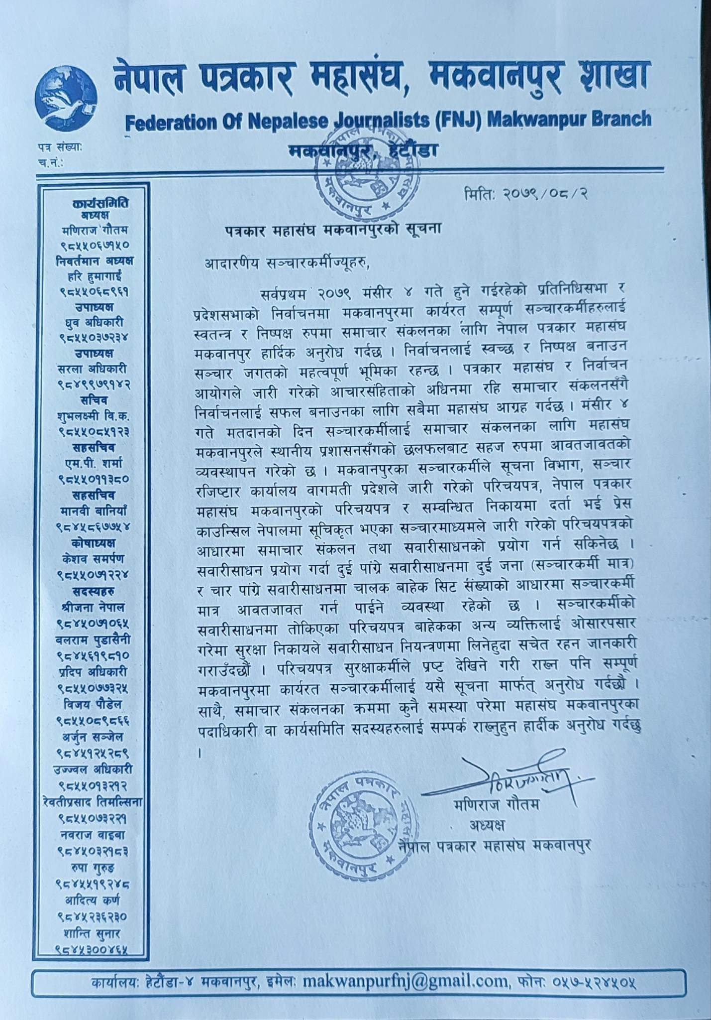 नेपाल पत्रकार महासंघ मकवानपुरले जिल्लाका सञ्चारकर्मीहरुले आफु आवद्ध सन्चार गृहको कार्ड प्रयोग गरि आइतबार हुने प्रतिनिधि सभा तथा प्रदेश सभा निर्वाचनको रिपोर्टिङ गर्न सक्ने जानकारी दिएको छ ।