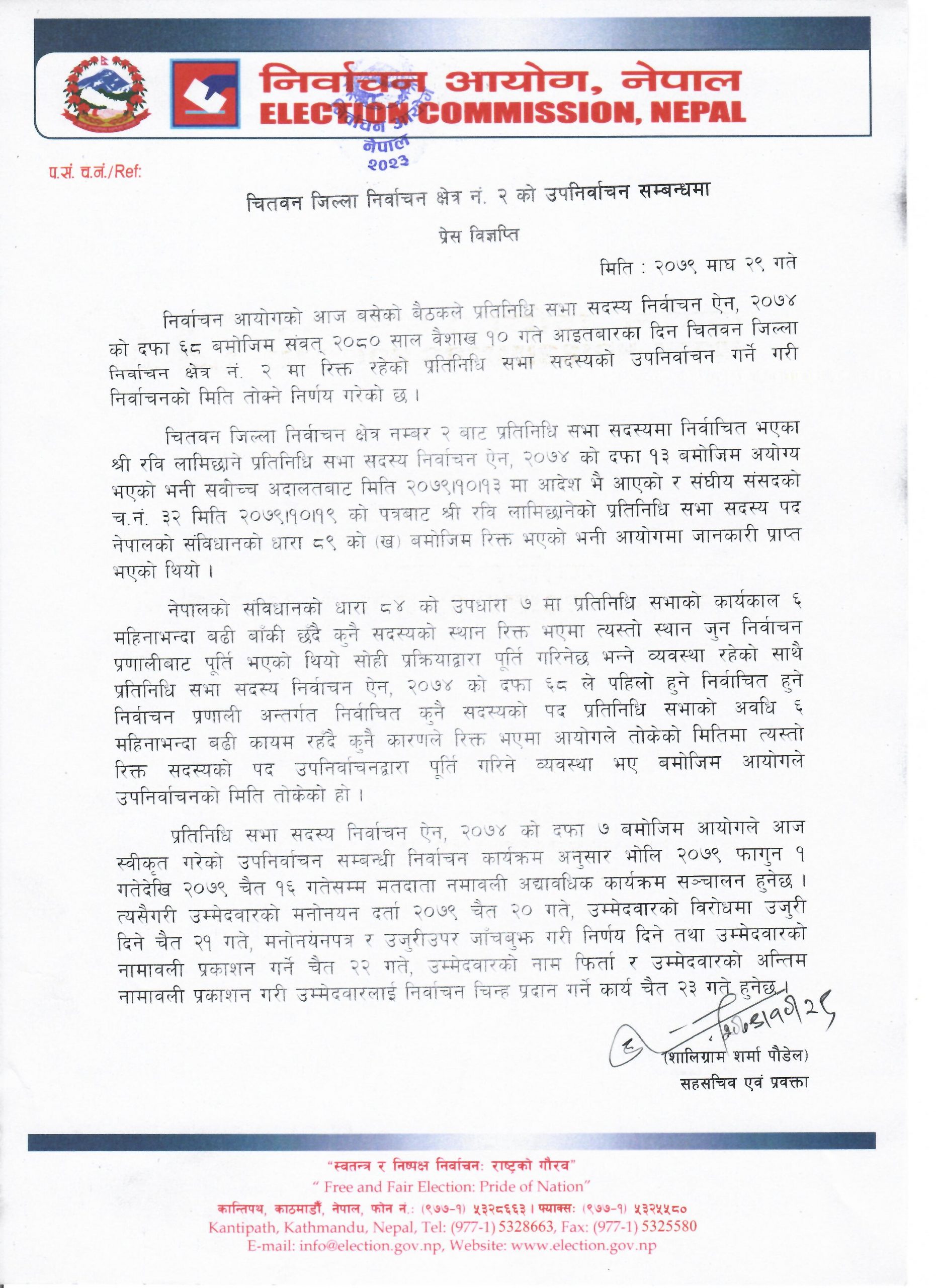 निर्वाचन आयोगले चितवन क्षेत्र नं. २ को उपनिर्वाचन वि. सं २०८० वैशाख १० गते गर्ने निर्णय गरेको छ ।