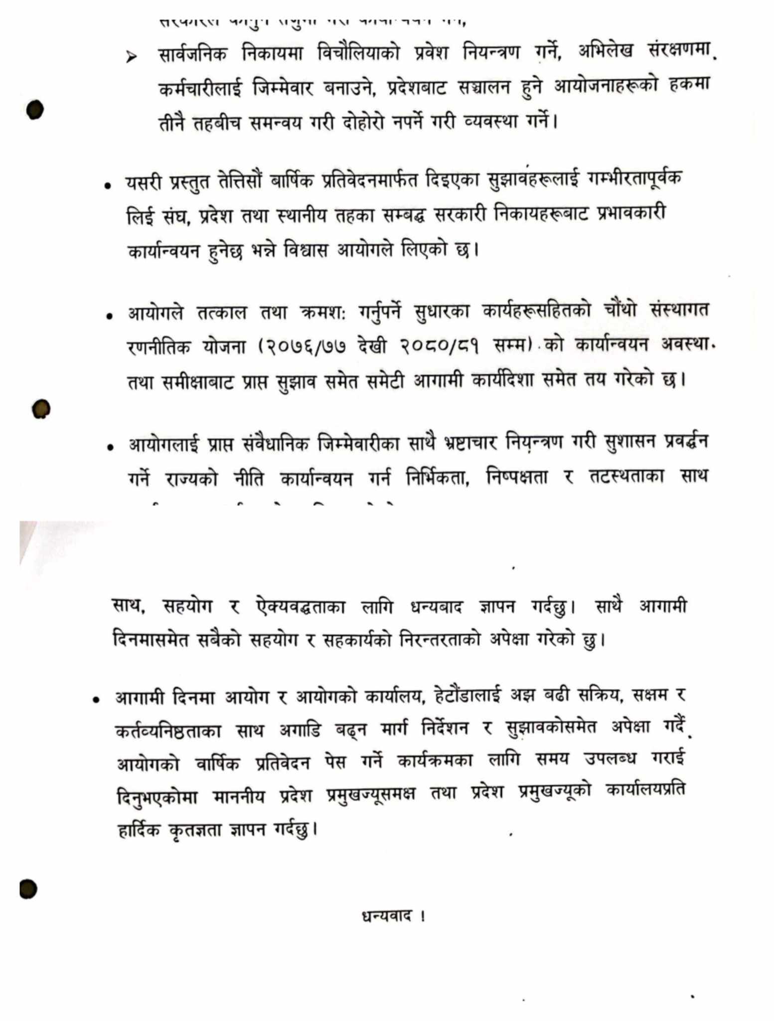 बुधबार अख्तियार दुरुपयोग अनुसन्धान आयोग हेटौंडाको आर्थिक वर्ष २०७९/८० को वार्षिक प्रतिवेदन बुझ्दै उहाँले न्याय सम्पादनका लागि सदाचार, निश्पक्षता, निर्भिकता लगायतका कुरासंगै शिघ्रता अत्यन्त जरुरी हुने बताउनुभयो । तसर्थ अख्तियारको संस्थागत मुल्यमान्यता भित्र शिघ्रतालाई महत्व दिएर काम गर्न उहाँले सुझाव दिनुभयो ।